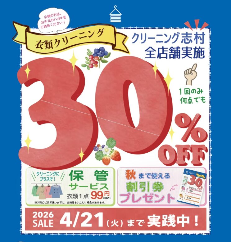 クリーニング志村では、本日より春の衣類30%セールを開催しています。
