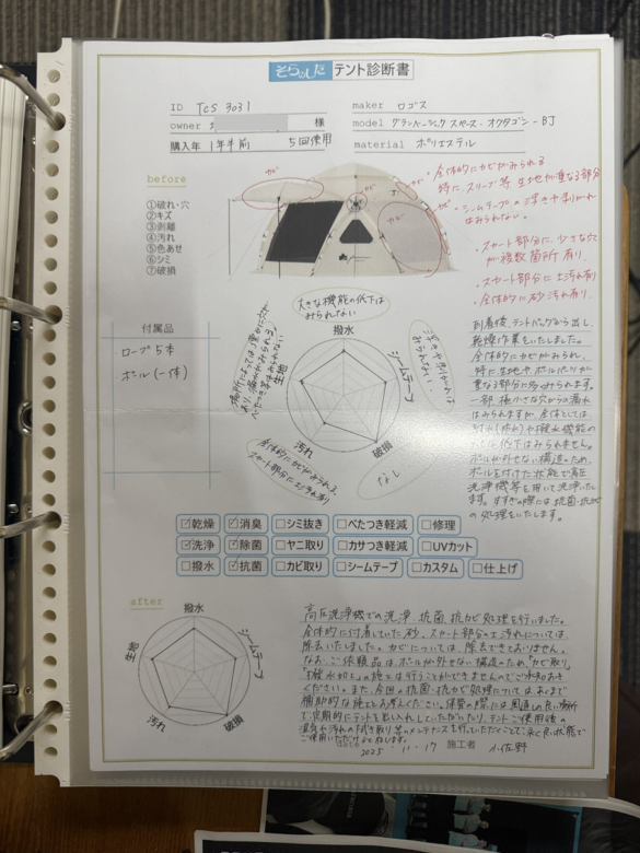 【テントのクリーニング紹介3】クリーニングのプロが驚いた、1枚のカルテに込められたテントへの愛情