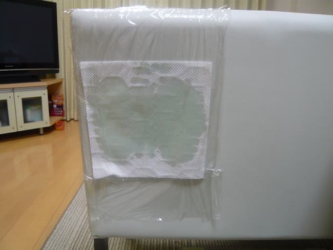 そして洗剤を染み込ませたキッチンペーパーでインク汚れを直接擦ります。 - 洗剤を染み込ませたキッチンペーパーをソファーの汚れている部分に貼り付け、上からラップを覆い被せて洗剤が漏れないようにします。